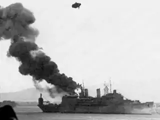 Во время атаки пикировщиков в корабль попала одна 250-кг бомба, нанесшая значительные повреждения. Хотя погибло много людей, это попадание не повлияло на остойчивость и плавучесть корабля. Бомба попала в верхнюю палубу правого борта по шпангоуту 60 и, пройдя сквозь главную палубу, взорвалась на бронированной второй палубе[6]. Это вызвало серьезные структурные повреждения и пожар, который было трудно потушить из-за падения давления в пожарной магистрали в это время. Дым от этого пожара, с которым люди боролись с помощью углекислотных огнетушителей с использованием спасательных дыхательных аппаратов старого типа, проник на вторую и третью палубы. Дым попадал в носовое машинное отделение через систему вентиляции. Его пришлось покинуть, что плохо сказалось на судьбе корабля. Наконец, огонь удалось потушить с помощью трех подошедших тральщиков[7].