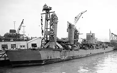 «Оглала» имела среднюю осадку 4,9 м, а при заводке в док она составляла 11,9 м, так как поднять минзаг выше нельзя было из-за проблем с остойчивостью[51]. Были некоторые опасения по поводу того что при буксировке могли не выдержать крепления коффердамов, но все обошлось[52]. В доке внутреннее оборудование было отремонтировано, включая главную силовую установку. Также обновили всю важную электропроводку[51].