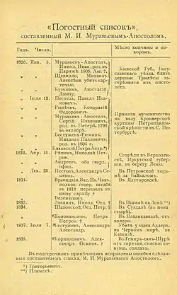 В фондах Государственного архива Российской Федерации по истории России XIX — начала XX в. хранится «Погостный список» декабристов с указанием дат и мест их смерти и захоронения, составленный М. И. Муравьевым-Апостолом в 1886 г.[1] Долгое время этот документ оставался единственным источником сведений об обстоятельствах кончины многих декабристов.