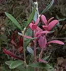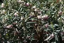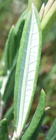 Листья ланцетовидные, с завёрнутыми вниз краями; сверху тёмно-зелёные, блестящие, снизу матово-белые от воскового налета, кожистые, с восковым налётом, длиной от 1 до 5 см и шириной от 2 до 8 мм.