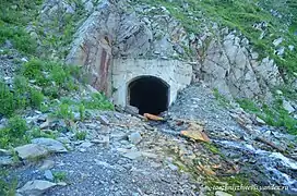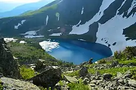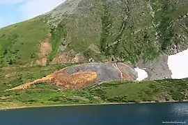 - Фотография с видом на Подбелкоговое озеро и ручей, вытекающий из заброшенной штольни.