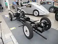 По сути вариант подвески «макферсон», сложный и очень редко встречавшийся. Для разгрузки брызговика крыла пружины в ней располагались не вертикально, а горизонтально продольно, и упирались задним торцом в перегородку между моторным отсеком и салоном (щит передка). Для передачи усилия от амортизаторной стойки на пружины было необходимо введение дополнительного качающегося в вертикальной плоскости продольного рычага (по одному с каждого борта), передний конец которого шарнирно закреплялся наверху стойки, задний — также шарнирно на щите передка с возможностью качания вверх-вниз, а в его средней части имелся упор для переднего торца пружины.