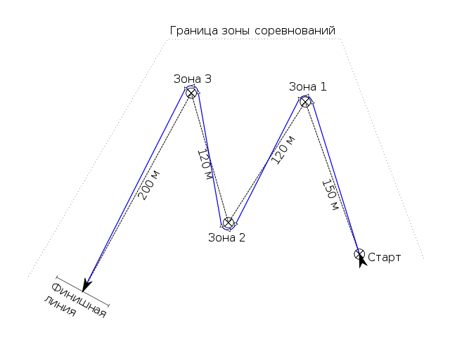 Также называется М по форме маршрута. Длина дистанции 590 метров. Маршрут включает стартовый буй, 3 зоны и финишную линию. Зоны обходятся с внешней стороны.