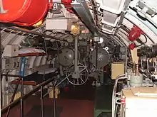 Машинное отделение, два дизеля, масляная система, расходный топливный бак, входной люк.