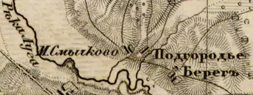 Согласно карте из «Исторического атласа Санкт-Петербургской Губернии» 1863 года рядом с деревней Подгородье находилась мыза Смычково и деревня Берег[14].