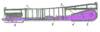Наибольшее распространение приобрели скребковые подземные механизированные бункеры, которые имеют простую, прочную и компактную конструкцию. Такой бункер (см. рисунок) состоит из аккумулирующего жёлоба 1, скребкового донного конвейера 2, механизма передвижения и системы автоматизированного управления. Конвейер, кроме рабочего органа 4, включает приводную (3), линейные (5) и концевую (6) секции.
