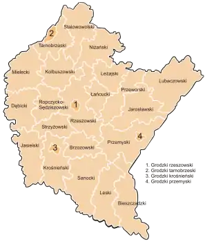 Площадь — 17 845,66 км². Население — 2 129 284 человека (2013)[1]. Административный центр — город Жешув. Важнейшие города — Жешув, Пшемысль, Сталёва-Воля, Кросно, Мелец, Тарнобжег, Дембица.