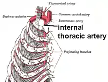 Внутренняя грудная артерия (лат. a. thoracica interna) — отходит от нижней поверхности подключичной артерии. Она кровоснабжает щитовидную железу, соединительную ткань верхнего и нижнего переднего средостения, главные бронхи, небольшие ветви отходят к перикарду, пристеночной плевре, кровоснабжает грудину, диафрагму, межрёберные и грудные мышцы, прямую мышцу живота и кожу данной области. Идёт в верхнем и нижнем средостении. В верхнем: позади грудино-ключичного сустава. В нижнем: сзади хрящей первого-седьмого рёбер на 2 см латеральней, и от бокового края грудины, под внутригрудной фасцией. Ниже хряща седьмого ребра она разветвляется на мышечно-диафрагменную и верхнюю надчревную артерию. Последняя будет анастомозировать с нижней надчревной артерией (лат. a. epigastrica inferior), которая относится к бассейну наружной подвздошной артерии (лат. a. iliaca externa).