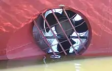 Рабочий канал подруливающего устройства с установленным гребным винтом. Видна решётка, защищающая гребной винт от удара о плавающие предметы