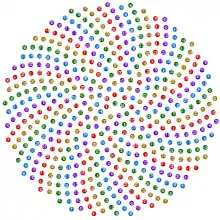 где θ — угол, r — радиус или расстояние от центра, а n — номер цветка и c — константа. Это форма спирали Ферма.