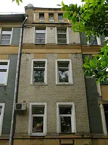 Заявленный объект культурного наследия[15], здание 1910 года постройки, архитектор — Виктор Мазырин. Автор особняка Арсения Морозова построил этот дом по своему типовому проекту (похожее здание было возведено на улице Машкова, 17)[18]. Фасад полностью покрыт керамической плиткой (кабанчиком) и расчленён лопатками болотного цвета на центральную и боковые части. Завершающие центральную и боковые части дома аттики выполнены в готических формах, сочетающихся с оформленными в стилистике модерна ограждениями трёх металлических балконов[19]. Несмотря на внешнюю простоту, доходный дом имеет запоминающийся стилистический облик.[18].