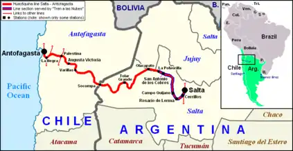Маршрут был разработан американским инженером Ричардом Мори[11] (который позже умер в Сальте), поэтому одна из станций названа в его честь[12]. Железная дорога была торжественно открыта 20 февраля 1948 года, после многочисленных задержек и осложнений, и 2-летнего периода, когда работа была парализована.