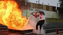 ж) четвёртый этап: спортсмен, приняв эстафету, подбегает к огнетушителю, берёт его, подносит к противню и тушит горящую жидкость. Оставлять огнетушитель в противне после ликвидации горения жидкости запрещается.