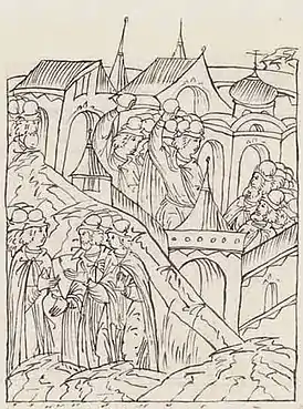 В 1382 году Москва подверглась крупному разрушению во время нападения золотоордынского хана Тохтамыша. Князь Дмитрий Донской был в отъезде, собирая войско в Костроме. Пользуясь его отсутствием, из города уезжали бояре и богатые москвичи. В ходе начавшегося восстания власть захватило вече. Осада Кремля монголо-татарским войском началась 23—24 августа, через два дня, поддавшись на уговоры, оставшиеся бояре, священнослужители и зажиточные посадские люди решили открыть городские ворота неприятелю. Ордынцы «град огнем запалиша, а товары и богатство все разграбиша», город был «взят и пожжен, не видети иного ничегоже, разве дым и земля, и трупиа мертвых лежаща; а церкви святыя запалены быша и падошася, а каменыя стояша, выгоревша внутри и огоревша вне»[50]. По другой версии, москвичи сами сожгли свой город. В этом пожаре пропали важные документы, летописи и рукописи[51]. Вернувшийся князь Дмитрий Донской выделил 300 рублей за погребение 24 тысяч погибших (согласно другим источникам, разбой Тохтамыша унёс не менее 60 тысяч жителей)[52][53]. После опустошительного нашествия город был быстро восстановлен и заново заселён[54][55]. События «Тохтамышева разорения» нашли отражение в народном фольклоре, например в «Повести о нашествии Тохтамыша»[56].