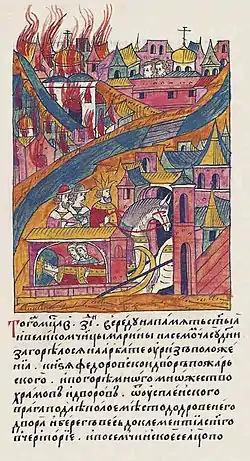 Июля в 14 день, в среду, загореся град Москва внутри града, в нощь, и выгоре весь, яко ни единому древеси на граде остатися, но и церкви каменныа распадошася, и стены градныа каменныа падоша во мнозех местех. А людей много множество изгоре. Казны же многи выгореша и безчисленное товара всякого, от многих бо градов множество людей бяху ту в осаде[50].