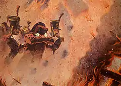 Самый крупный московский пожар столетия начался в ночь со 2 (14) на 3 (15) сентября 1812 года, после вступления в город войск Наполеона. Сильное возгорание длилось около недели и окончательно утихло лишь к 6 (18) сентября. По свидетельствам очевидцев, «в покинутой жителями Москве очаги пламени, раздуваемые ураганным ветром, слились в один огромный костер». По распространённой версии, приказ поджигать покинутый город отдал московский генерал-губернатор, граф Фёдор Ростопчин[235]. Однако большой урон городу нанесли оккупанты, на Тверской сохранилось лишь 12 домов, а в Китай-городе — два, в пожаре погибли Императорский университет с библиотекой и архивами. Были утрачены многие памятники культуры: считается, что в то время сгорел единственный экземпляр «Слова о полку Игореве» из коллекции Алексея Мусина-Пушкина[236]. При отходе французские войска заминировали Грановитую палату, Арсенал, колокольню Ивана Великого, башни и стены Кремля. Несколько башен с пряслами, часть Арсенала и две пристройки к колокольне были взорваны. Среди уцелевших исторических зданий — Английский двор XV века в Зарядье, самое старое «многоэтажное здание» древней столицы — сушило Симонова монастыря, а также дом Фёдора Растопчина[237]. В результате отступления, по подсчётам историков, сгорело две трети построек: из 2567 каменных домов сгорело около двухсот, а из 6591 деревянных уцелело порядка 250. Кроме того, в огне пострадали 122 храма, 8251 складское и торговое помещение. Общий ущерб от городских разрушений был оценён в 320 миллионов рублей[238][239]. По масштабам реконструкции этот проект сравнивают с возведением Петербурга в XVIII веке[208].