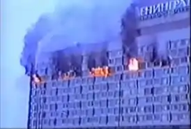...По всему фасаду здания вдоль этого этажа горят окна, горят номера. Огонь выбивается наружу, лопаются стёкла, стёкла падают вниз...[1]