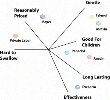 | Простая карта восприятия категории транспортных средств США (с использованием двух переменных) | Многомерная карта восприятия категории анальгетиков | Карта восприятия для гипотетической категории товаров |