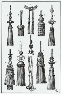 - Кисти состоят из головки и бахромы. Головка состоит из деревянной кольцеобразной формочки (каркаса), обматываемой или оплетаемой на особом станке соответственного качества пряжей. Бахрома образуется как указано выше и прикрепляется к головке посредством подложенного снизу деревянного кружочка, придающего бахроме красивый выпуклый вид.