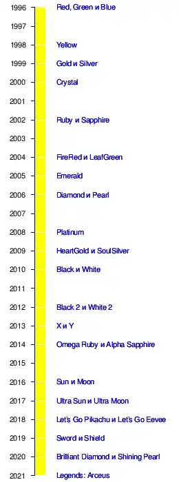 По хронологии выхода серию игр делят на поколения. Каждое поколение начинается с выхода пары игр основной серии на портативную игровую систему. Как правило, эти две игры почти ничем не отличаются друг от друга, кроме покемонов для ловли. На данный момент существует восемь поколений. С каждым поколением увеличивается количество существующих видов покемонов, и появляются нововведения в игровой процесс. Игры основной серии сделаны в жанре японской ролевой игры, а многочисленные игры-ответвления бывают самых разных жанров[13].