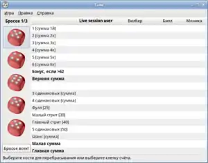 - большой стрит — последовательность пяти костей 1, 2, 3, 4, 5 или 2, 3, 4, 5, 6
