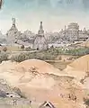 На заднем плане раскинулась привольная мирная долина, купающаяся в горячих лучах солнца. Золото неба у горизонта выше переходит в лазурную дымку — этот приём становится обычным в зрелом творчестве Босха.