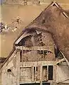 Персонаж, сидящий на вязанке хвороста под дырявой крышей, сушит какие-то вещи над огнём. Вероятно, это Святой Иосиф, занятый сушкой пелёнок младенца Христа.