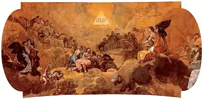 Фреска в её окончательном варианте демонстрирует стереотипы позднего барокко в католической религиозной живописи. По обе стороны расположены группы ангелов, чьё внимание устремлено в центр композиции, на символ ЙХВХ(Иегова) - равнобедренный треугольник с вписанным священным именем. Из-за того, что группы расположены на разных высотах, композиция выглядит довольно статичной.