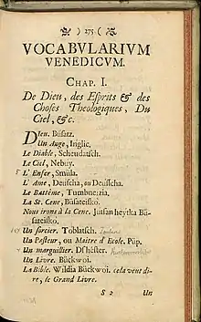 - французско-полабского словаря, составленного Иоганном Пфеффингером в 1696 году и дошедшего до нас в составе книги Historia studii etymologici linguae Germanicae hactenus impensi Иоганна фон Экхарта (нем. Johann Georg von Eckhart).