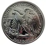 На реверсе изображён геральдический символ США — белоголовый орлан, стоящий на скале с полурасправленными крыльями. Над ним полукругом расположена надпись «UNITED STATES OF AMERICA», слева — «E PLURIBUS UNUM» (с лат. — «Из множества — одно»), а снизу номинал монеты — «HALF DOLLAR».