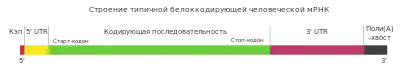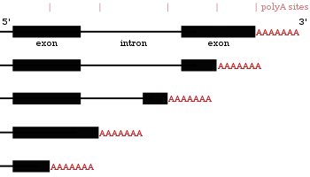 Многие белоккодирующие гены могут иметь более одного сайта полиаденилирования, поэтому с одного и того же гена можно получить несколько РНК, различающихся своими 3'-концами[20][44][45]. Это явление получило название альтернативного полиаденилирования. Поскольку альтернативное полиаденилирование изменяет длину 3'-UTR, оно может повлиять на то, какие сайты связывания с микроРНК останутся на транскрипте[12][46]. Обычно микроРНК подавляют трансляцию и запускают деградацию мРНК, с которыми они связаны, хотя известны примеры, когда микроРНК стабилизирует транскрипт[47][48]. Альтернативное полиаденилирование может также изменить длину кодирующей области, из-за чего получающиеся мРНК будут кодировать различные белки[49][50], однако такое явление встречается реже, чем укорочение 3'-UTR[20].
