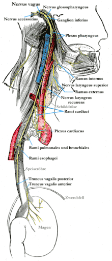 С развитием сложности нервной системы у млекопитающих развилась более продвинутая система, которая развила поведенческие и аффективные реакции на всё более сложное внешнее окружение. Вентральная ветвь блуждающего нерва берёт начало в двойном ядре (nucleus ambiguus) и, является миелинизированной, что даёт большую управляемость и скорость реакции. Эта ветвь также известна как "умный вагус", поскольку связана с регуляцией поведения "борьба или бегство" (проявления симпатической системы) с целью поддержания социально дружественных форм поведения. Эти виды поведения включают социальную коммуникацию, действия, направленные на самоуспокоение и самоутешение. Другими словами, эта ветвь блуждающего нерва в зависимости от ситуации может тормозить и растормаживать защитные лимбические сети. ВВК предоставляет первичное управление наддиафрагмальными внутренними органами, такими как пищевод, бронхи, гортань и глотка. ВВК также оказывает важное влияние на сердце. Когда тонус блуждающего нерва воздействует на сердечный водитель ритма, наблюдается базовая частота сердечных сокращений в покое. Иначе говоря, блуждающий нерв действует как тормоз, ограничитель, ограничивая частоту сердечных сокращений. Однако, когда тонус блуждающего нерва снижается, водитель ритма испытывает минимальное тормозящее влияние, поэтому в случае стресса может быстро активироваться мобилизация (борьба/бегство) без задействования симпато-адреналовой системы, поскольку её активация требует серьёзных биологических затрат.