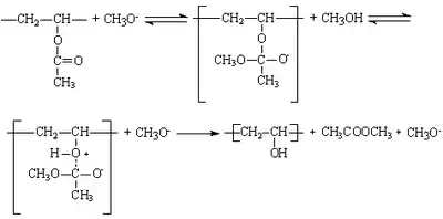 - Алкоголиз сложных поливиниловых эфиров в среде осушенных низших алифатических спиртов (C1-C3), в частности метанола, в присутствии гидроксидов щелочных металлов. Процесс щелочного алкоголиза сопровождается гелеобразованием.