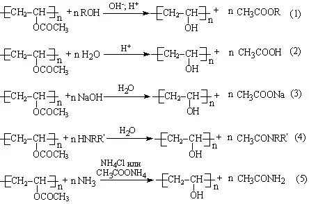 Приведённые схемы реакций можно разбить на три группы: алкоголиз (1), щелочной или кислотный гидролиз (2,3) и аминолиз (4,5). Синтез ПВС через реакцию полиальдольной конденсации из ацетальдегида до настоящего времени оканчивался получением низкомолекулярного полимера. Из всего массива литературных данных, посвящённых разработке методов синтеза ПВС, можно выделить пять основных направлений: