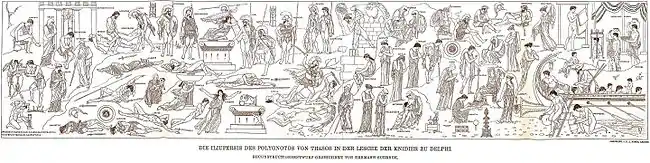 Фигуры на картинах Полигнота были выполнены очерком и окрашены лишь несколькими красками, которые выделялись на цветном фоне стен. Несмотря на полное отсутствие в них моделирования человеческого тела и перспективы, они представляли собой в истории живописи значительный шаг вперёд, поскольку, по преданию, в них отмечались ритмичность композиции, благородство форм и выразительность — качества, которые отсутствовали в произведениях архаического периода.