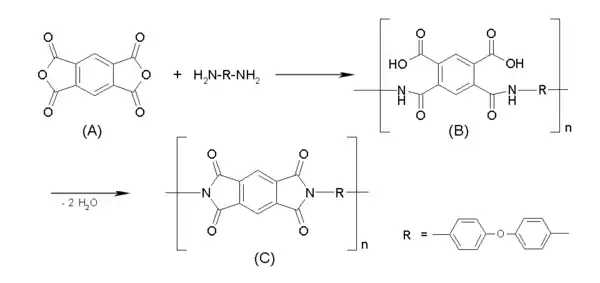 Полиимиды обычно получают поликонденсацией диангидридов тетракарбоновых кислот — пиромеллитовой (бензол-1,2,4,5-тетракарбоновой), 3,3',4,4'-тетракарбоксидифенила и т. п.) с диаминами, в случае синтеза термостойких полиимидов обычно используются ароматические диамины (4,4'-диаминодифенилоксид, м-фенилендиамин и т. п.). В случае плавких полиамидов поликонденсация может быть проведена в расплаве в одну стадию, однако в случае термостойких и нерастворимых полиимидов используется двухстадийный процесс. Первая стадия поликонденсации проводится в растворе, при этом взаимодействием диангидрида (например, диангидрида пиромеллитовой кислоты A) c диамином синтезируют полиамидокислоту B, в качестве растворителей обычно используются алифатические амиды (диметилформамид, N,N'-диметилацетамид, N-метилпирролидон) или диметилсульфоксид. Получившаяся на первой стадии полиамидокислота далее циклизуется в полиимид С:
