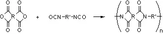Полиимиды также синтезируют взаимодействием ангидридов тетракарбоновых кислот с диизоцианатами, реакция идёт с выделением диоксида углерода: