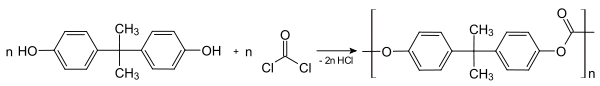 Фосгенирование бисфенола А проводят в растворе хлоралканов (обычно хлористого метилена CH2Cl2) при комнатной температуре, существует две модификации процесса — поликонденсация в растворе и межфазная поликонденсация: