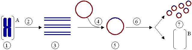 (1) Хромосомная ДНК организма A. (2) ПЦР. (3) Множество копий гена организма А. (4) Вставка гена в плазмиду. (5) Плазмида с геном организма А. (6) Введение плазмиды в организм В. (7) Умножение количества копий гена организма А в организме В