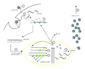 3 — трансляция белков вируса с его РНК с образованием полипептида;
