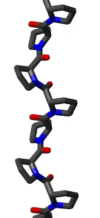 Подстановка двугранных углов поли-Про II (φ, ψ) в это уравнение дает почти точно Ω = −120°, то есть Спираль PPII является левозакрученной спиралью (поскольку Ω отрицательна) с тремя остатками на оборот (360°/120° = 3). Сдвиг цепи на остаток составляет приблизительно 3,1 Å. Эта структура в некоторой степени похожа на структуру волокнистого белка коллагена, который состоит в основном из пролина, гидроксипролина и глицина. Спирали PPII специфически связываются доменами SH3; это связывание важно для многих белок-белковых взаимодействий и даже для взаимодействий между доменами одного белка.