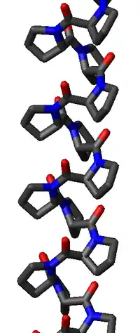 Полипролиновая спираль — это тип вторичной структуры белка, который встречается в последовательностях аминокислот, содержащих повторяющиеся остатки пролина[1]. Левозакрученная спираль полипролина II (PPII, поли-Про II) образуется, когда все последовательные аминокислотные остатки принимают двугранные углы (φ, ψ) основной цепи примерно (-75°, 150°) и имеют транс- изомеры своих пептидных связей. Эта конформация PPII также характерна для белков и полипептидов с другими аминокислотами, кроме пролина. Аналогичным образом, более компактная правозакрученная спираль полипролина I (PPI, поли-Про I) образуется, когда все последовательные остатки принимают двугранные углы (φ, ψ) основной цепи примерно (-75°, 160°) и имеют цис- изомеры своих пептидных связей. Из двадцати обычных встречающихся в природе аминокислот только пролин, вероятно, принимает цис- изомер пептидной связи, особенно пептидную связь X-Про; стерические и электронные факторы в значительной степени благоприятствуют транс- изомеру в большинстве других пептидных связей. Однако пептидные связи, которые заменяют пролин другой N- замещенной аминокислотой (такой как саркозин), также могут принимать цис- изомер.