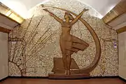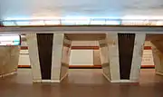 Пилоны облицованы жёлтым мрамором, сужаются к низу и имеют вертикальные вентиляционные решетки. Освещение центрального зала — закарнизное; боковые залы освещают световые линии, оформленные поперечными стеклянными пластинами. В торце центрального зала — аллегорическая барельефная композиция, посвящённая освоению космоса — девушка на фоне серпа и молота. Лезвие серпа переходит в трассу движения Спутника-1, который летит к солнцу.