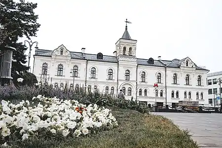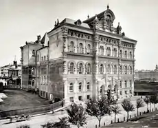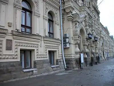 Отстроенная центральная часть здания не могла вместить всю коллекцию музея. Несмотря на это, возведение северного и южного крыльев отложили из-за смерти архитектора Монигетти и недостатка финансирования[48]. Чтобы продолжить строительство, комитет был вынужден заключить сделку с частными предпринимателями: они получали в долгосрочную аренду нижний и подвальные помещения со стороны Ильинского сквера. В 1886-м задумку Монигетти переработал инженер И. А. Сытенко при помощи архитекторов Николая Шохина и Августа Вебера. Они переоформили фасад в русском стиле, сделав его гораздо скромнее центральной части. Композиционные элементы вытянули по горизонтали, сместив уровень этажей.