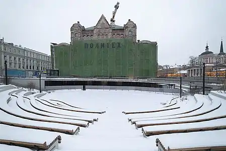 В августе 2019-го с Политехнического музея сняли леса, а в сентябре посетителям открыли площадку «Музейный парк» — пешеходную зону на уровне подвального яруса музея, объединяющую сквер Соловецкого камня с площадью у памятника героям Плевны. Уличная галерея находится на четыре метра ниже тротуара, она покрыта гранитной брусчаткой с автоматическим подогревом[134][137][148]. Центром общественного пространства стал амфитеатр, обустроенный на месте Политехнического проезда, где планируется проводить общественные мероприятия[149]. Сразу после открытия амфитеатр стал одной из площадок фестиваля «Круг Света»[150].