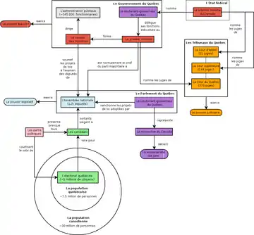 Поли́тика Квебе́ка основывается на парламентарном режиме британского типа и вестминстерской системе. Британская парламентская система, введённая в провинции Нижняя Канада в 1791, впоследствии многократно и значительно изменялась и развивалась. Ниже на схеме представлена работа действующей политической системы в Квебеке после реформы 1968 года. До этой реформы парламент Квебека был двухпалатным.