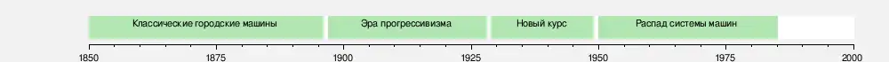 Развитие политических машин прошло четыре этапа[2]. Классические машины первого поколения (1840—1896) возникли в середине XIX века, достигли расцвета в «позолоченный век» и утратили власть в 1890-е годы, уступив политикам-прогрессивистам[3]. В эру прогрессивизма (1896—1928) к власти пришли машины второго поколения[4]. В период Великой депрессии, Второй мировой войны и первых послевоенных лет (1929—1950) большинство из них ослабли и утратили влияние, однако в Чикаго и Питтсбурге сложились устойчивые и долговечные машины нового, третьего типа[5]. Эти машины успешно мобилизовали голоса городского среднего класса, но не сумели привлечь афроамериканцев и латиноамериканцев, и к концу четвёртого, заключительного этапа (1950—1985) сошли со сцены[6]. Маши́нная поли́тика (англ. machine politics) — политическая деятельность, построенная на непосредственном взаимовыгодном обмене между выборными должностными лицами и их избирателями — продолжает действовать и после отмирания политических машин.