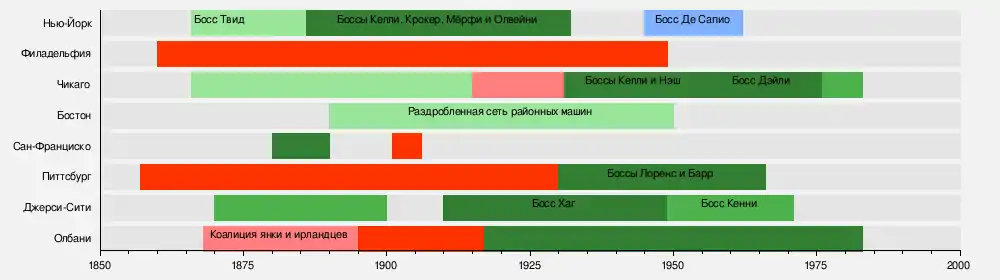 К 1890 году машины контролировали десять из двадцати крупнейших городов США[25]. Машины Демократической партии управляли Нью-Йорком (в то время — в границах Манхэттена), Бруклином (в то время — самостоятельным городом), Джерси-Сити, Сан-Франциско и Олбани[25]. Машины республиканцев управляли Буффало, Питтсбургом, Филадельфией и Цинциннати; машина Эдварда Батлера в Сент-Луисе формально принадлежала Демократической партии, а фактически работала на республиканцев[25][11]. Причины, по которым в одних городах сложились мощные машины, а в других (например, в Бостоне) они не достигли власти или не возникли вообще, достоверно не известны. По мнению Стивена Эри, главной составляющей успеха были политические союзы молодых боссов с губернаторами штатов и федеральными властями, которые и поддерживали машину в критический период её становления.