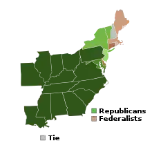 Главным оппонентом федералистов стала Демократическо-республиканская партия (англ. Democratic-Republican Party), созданная в 1792 году Джеймсом Мэдисоном, бывшим соратником Вашингтона и Гамильтона, и Томасом Джефферсоном, занимавшим пост государственного секретаря в первом кабинете президента Вашингтона[6]. После того как в 1800 году Джон Адамс не сумел добиться переизбрания, а федералисты навсегда потеряли большинство в Палате представителей и Сенате, Демократическо-республиканская партия стала доминирующей политической силой в Соединённых Штатах.