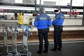 Транспортная полиция Швейцарских федеральных железных дорог (CFF), иногда называемая «общинной полицией [33][34]», является полицейским корпусом, отвечающим за поддержание порядка и безопасности на вокзалах и на транспортных объектах нескольких компаний общественного транспорта[35]. С 1 января 2011 года она полностью интегрирована в состав CFF.[36] Корпус состоит из 245 человек, включая 187 мужчин и женщин полицейских, и разделен на 3 региона и 12 опорных пунктов[37]. Некоторые кантоны подписали соглашение о сотрудничестве с CFF, чтобы расширить полномочия транспортной полиции на своей территории[38]. С 2012 года Transports Publics Genevois пользуются их услугами.[39] Транспортная полиция также оказывает поддержку кантональной полиции во время чрезвычайных происшествий. В частности, она выполняет функции экстренной полиции на железнодорожном вокзале Лозанны.